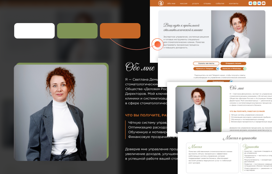 Мы создали персональный сайт для специалиста с 20-летним опытом в управлении стоматологическими клиниками. Светлана помогает владельцам и управляющим частных клиник выстраивать системные процессы, повышать доходность и внедрять прозрачные управленческие решения. Основная цель сайта — продемонстрировать экспертность, вызвать доверие и упростить взаимодействие с целевой аудиторией — владельцами и менеджерами частных клиник по всей Казахстану.