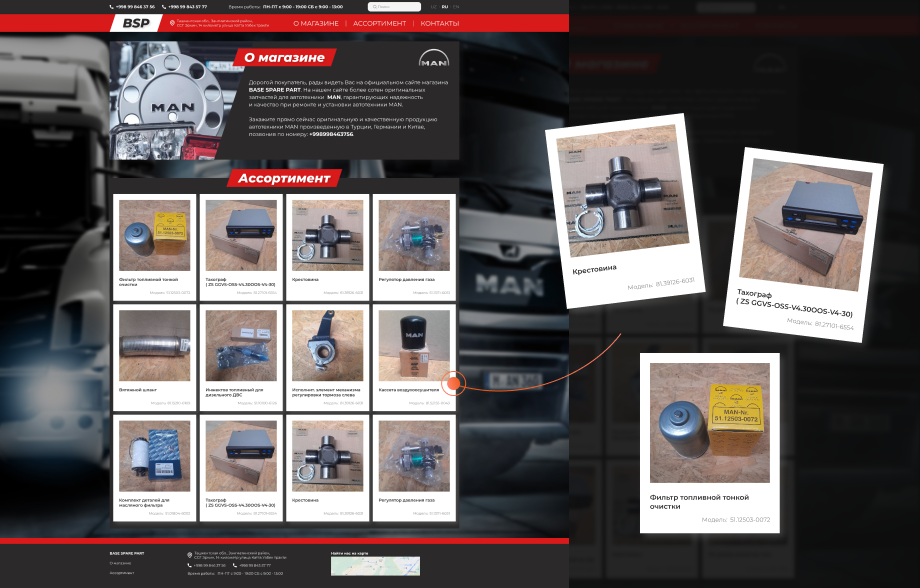 Проект был ориентирован на создание интуитивно понятного и практичного сайта-каталога для магазина BASE SPARE PART, специализирующегося на реализации оригинальных и аналоговых автозапчастей для грузовых автомобилей, в том числе марок MAN и Mercedes-Benz. Основная задача заключалась в том, чтобы предоставить пользователю удобный инструмент для быстрого поиска деталей, визуальной оценки ассортимента и лёгкой связи с менеджером магазина.