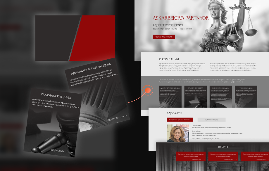 К нам обратилась команда юридической компании "Askarbekova Partner" с задачей разработать современный, имиджевый и функциональный сайт в Казахстане, который бы отражал высокий статус и профессионализм их адвокатского бюро. Основная цель заключалась в том, чтобы подчеркнуть опыт специалистов, укрепить доверие клиентов и обеспечить удобство получения юридических услуг через онлайн-форму заявки.