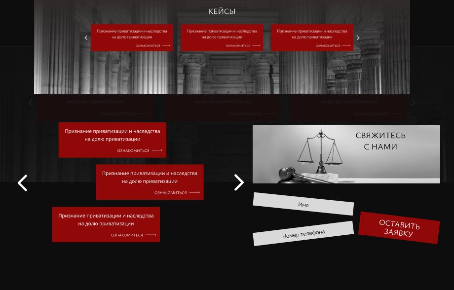 Дизайн сайта выполнен в строгой серо-черно-белой гамме с яркими акцентами бордового цвета. Такой выбор палитры подчеркивает деловой стиль, авторитетность и надежность юридической сферы. В качестве визуальных элементов использованы изображения символов правосудия — весов, колонн, статуй Фемиды — что создает атмосферу доверия и профессионализма.