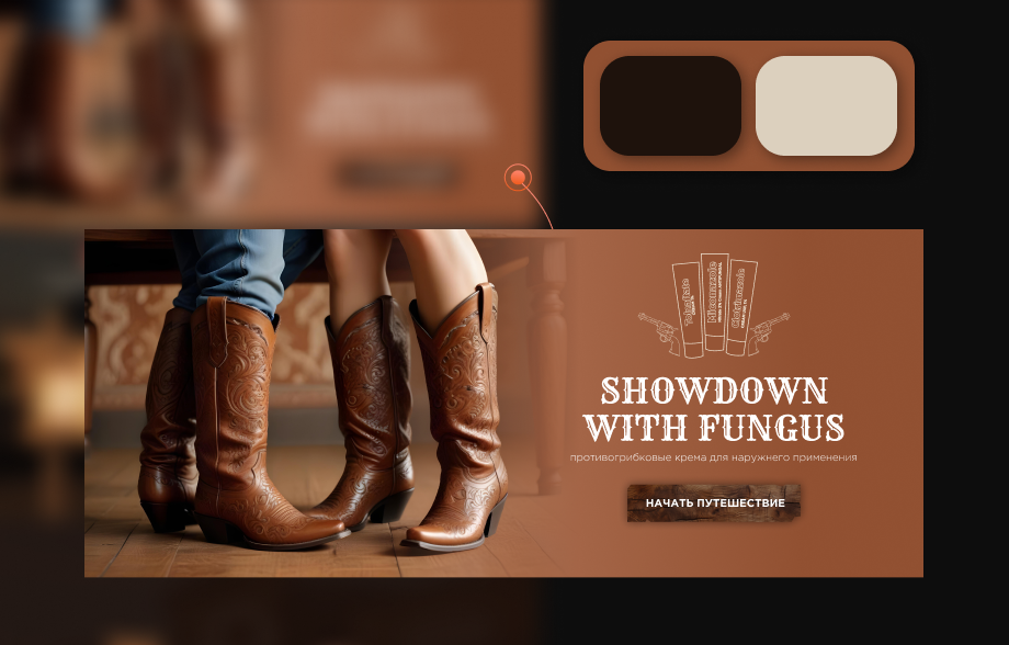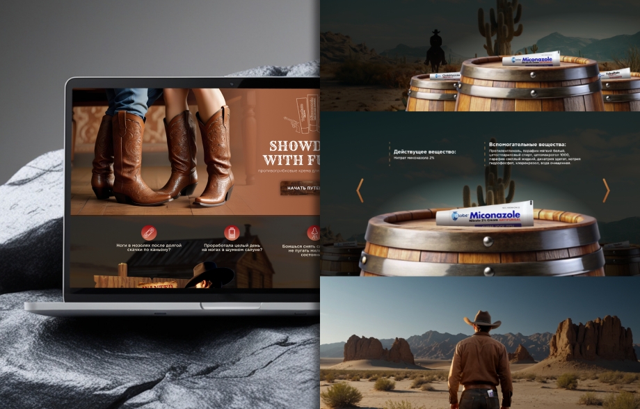 Концепция сайта основана на образах Дикого Запада: грибок представлен как «враг», с которым предстоит сразиться. Это позволило превратить стандартную медицинскую тему в зрелищный и увлекательный рассказ, где пользователь как бы становится участником борьбы. В дизайне используются атмосферные иллюстрации, типографика в стиле вестерна, анимированные элементы, а также креативные образы мазей в формате «разыскивается» (Wanted).