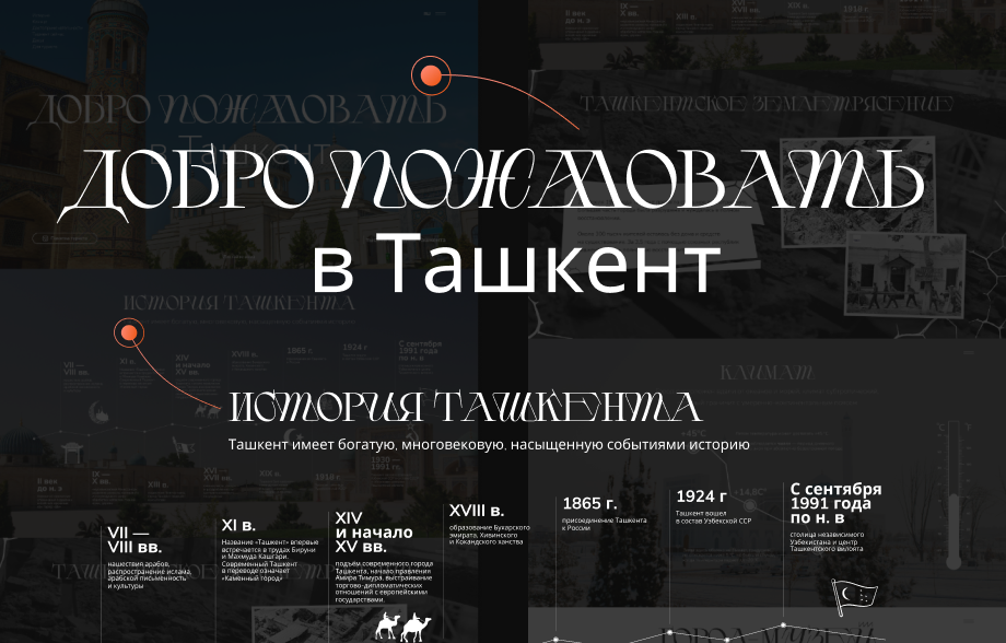Основная цветовая палитра — насыщенный синий (передаёт атмосферу Востока), белый (чистота и лёгкость) и ярко-жёлтые акценты (подчёркивание важной информации). Например, блок «Ташкент сейчас» использует жёлтые маркеры для выделения ключевой статистики.