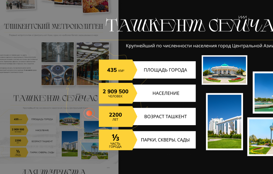 - «Ташкент сегодня» — это визуальная инфографика с данными о численности, возрасте, площади и зелёных зонах.